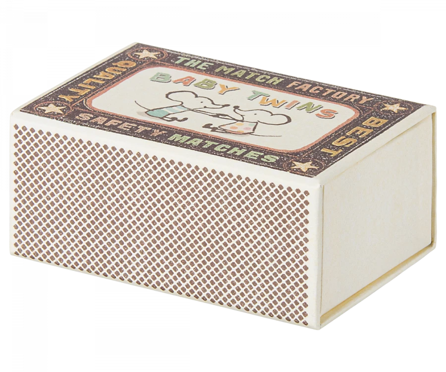 A classic Maileg item. These baby twin mice sleep safely in their sleeping bag side by side, tucked in the matchbox bed. These mice fit all accessories in size baby mouse. Fabric may vary.