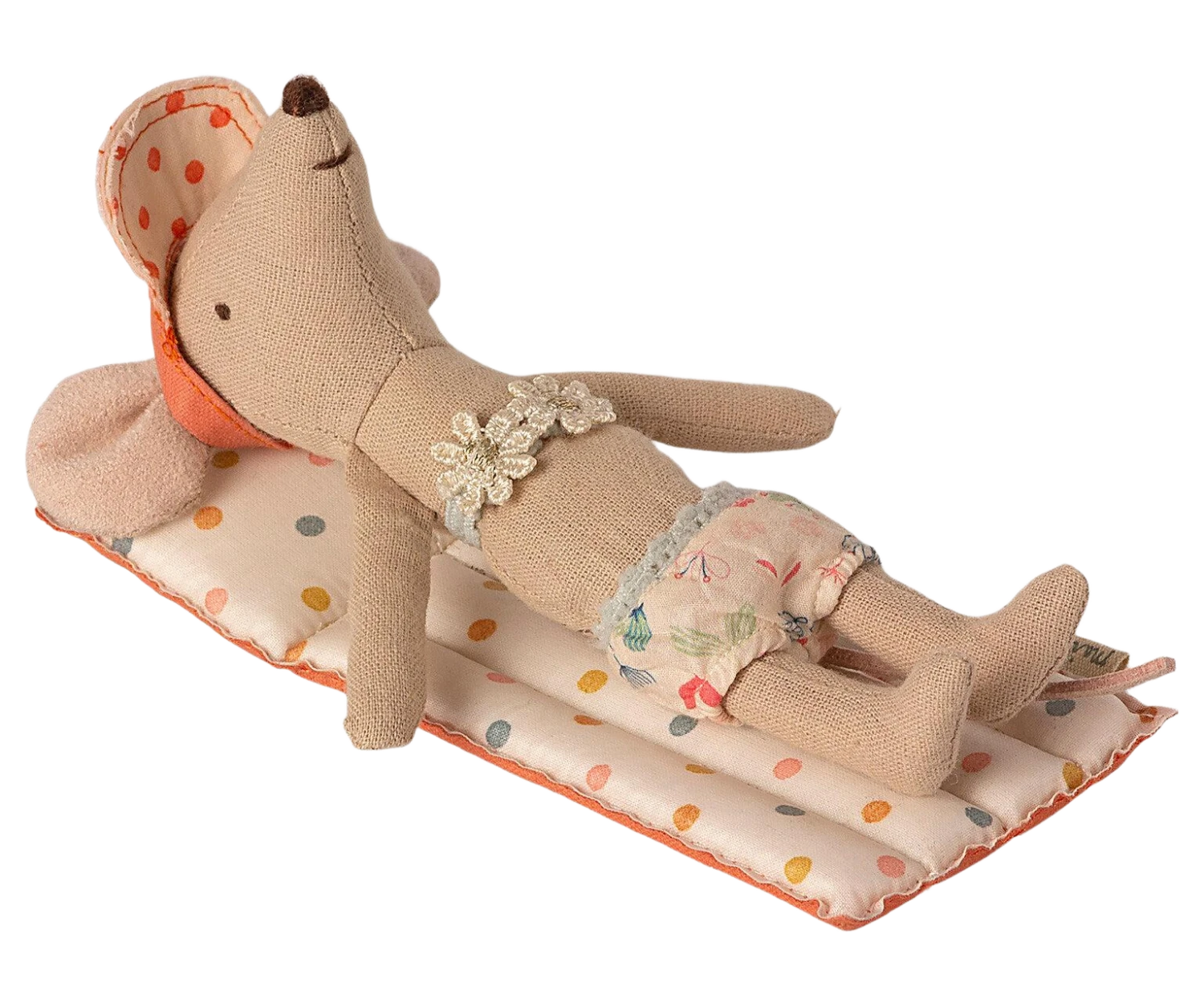 | Vacation time. An air mattress made in coated fabric for an authentic look. It is not waterproof, so only play on dry ground… only in your imagination, it can float on water. This set fits all micro mice sizes. |