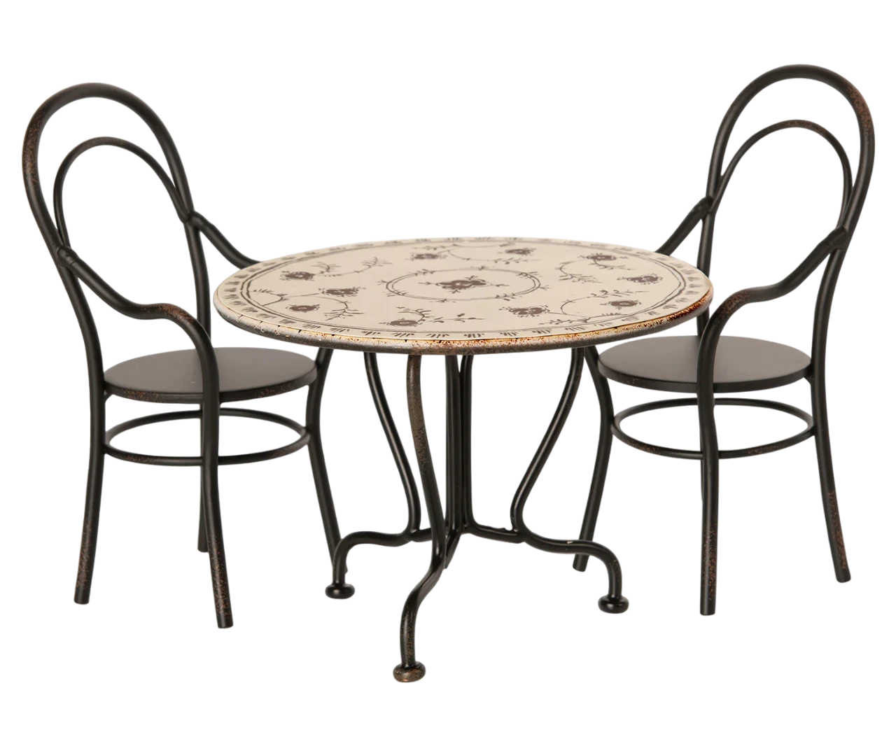 Invite your friend for Sunday supper at the dining table. The round table comes with 2 sturdy metal chairs. The table and chairs fit in the dollhouse, where rabbits and bunnies in size 1 and 2, and Teddy family can be seated.