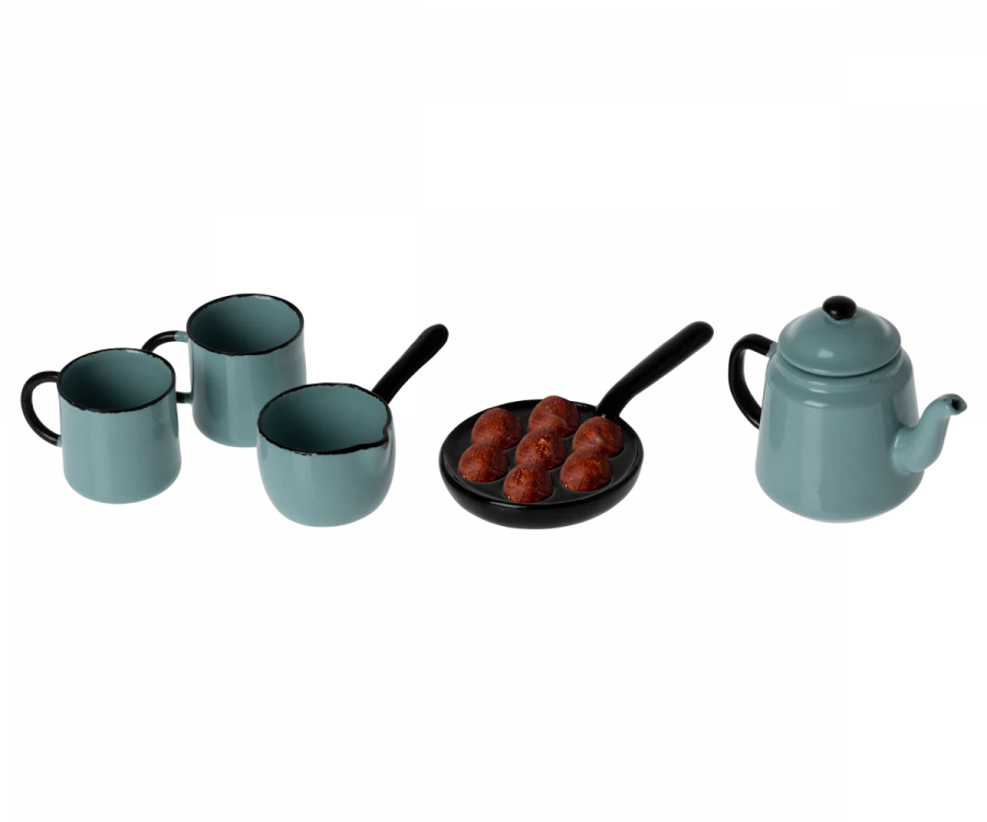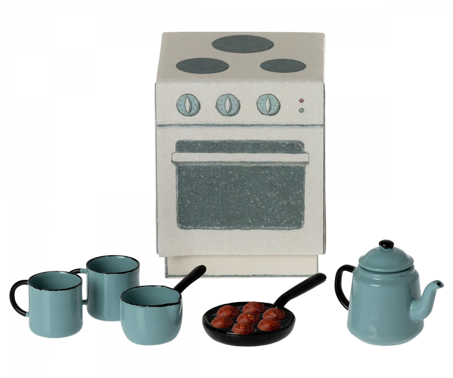 Our Madam Blue’s Favorites set includes a sweet pot and two cups, a saucepan and a pan with delicious puff cakes – which are a traditional Scandinavian treat in the winter time. All these parts come in a sturdy paper box that looks like a stove and opens up. This set is the perfect size for our Mouse family.