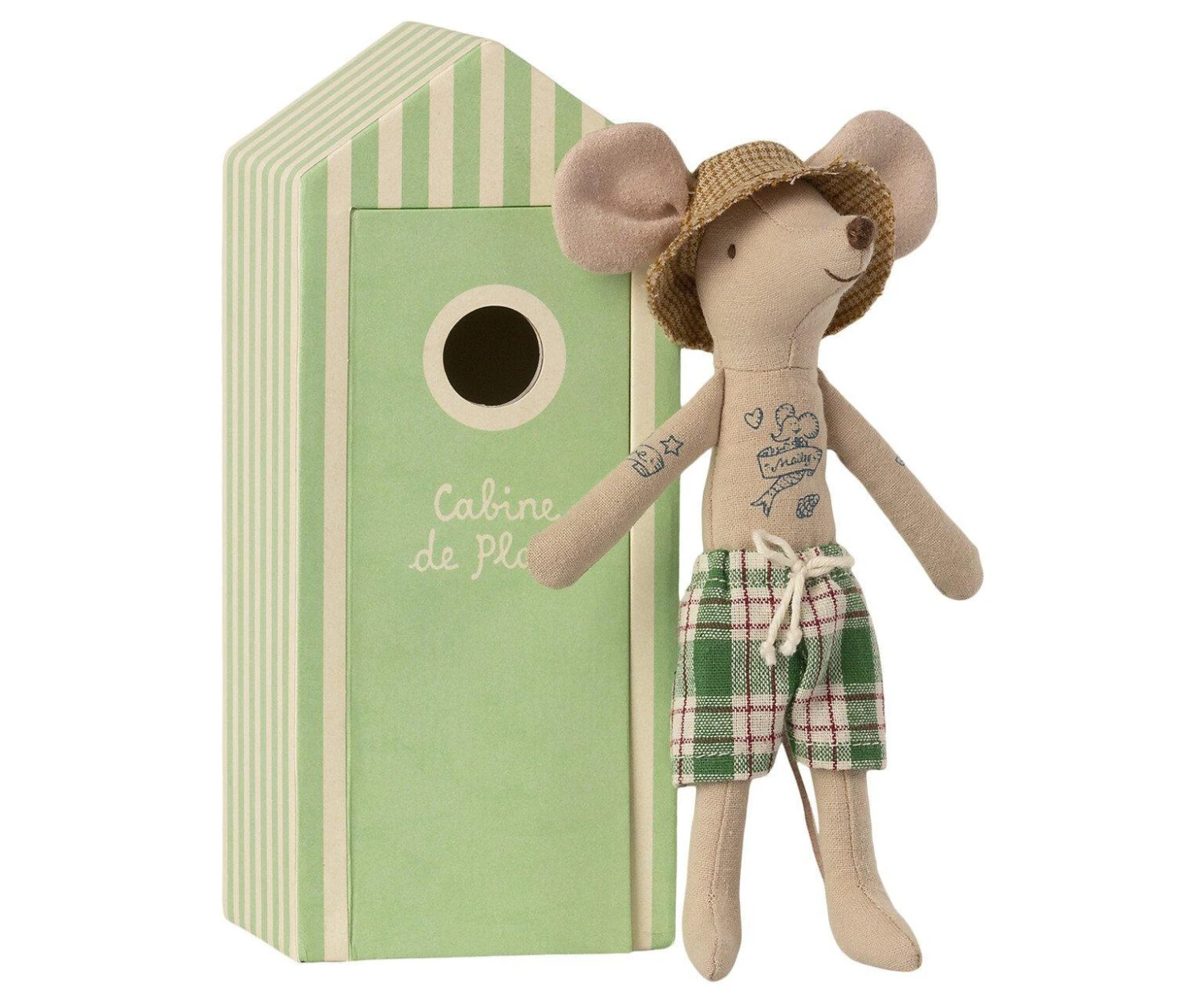 | Vacation time! Dad mouse is ready for a day at the beach, with his sun hat, swim trunks, and a beautiful striped beach house. |