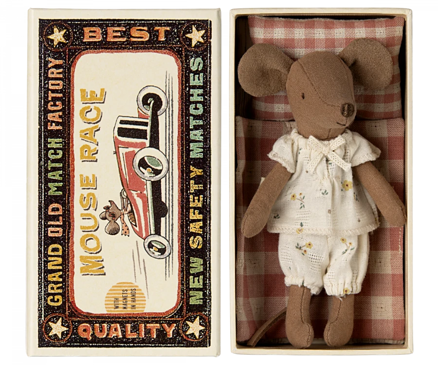 A classic Maileg item. This mouse is ready for hours of play and sleeps tight in the little matchbox. The clothes and bedlinen are made of soft fabrics with unique prints in beautiful colors. Extend the story by adding accessories to the play