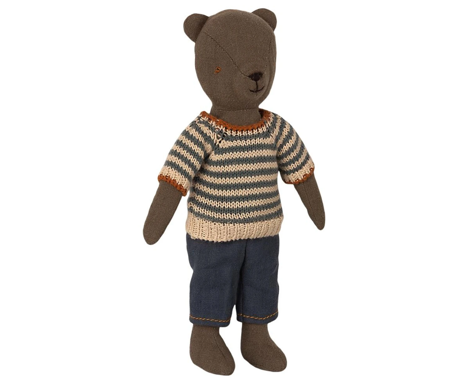 A beautiful set of clothes that fits the Teddy dad perfectly. This set includes a pair of pants and a soft knitted sweater.