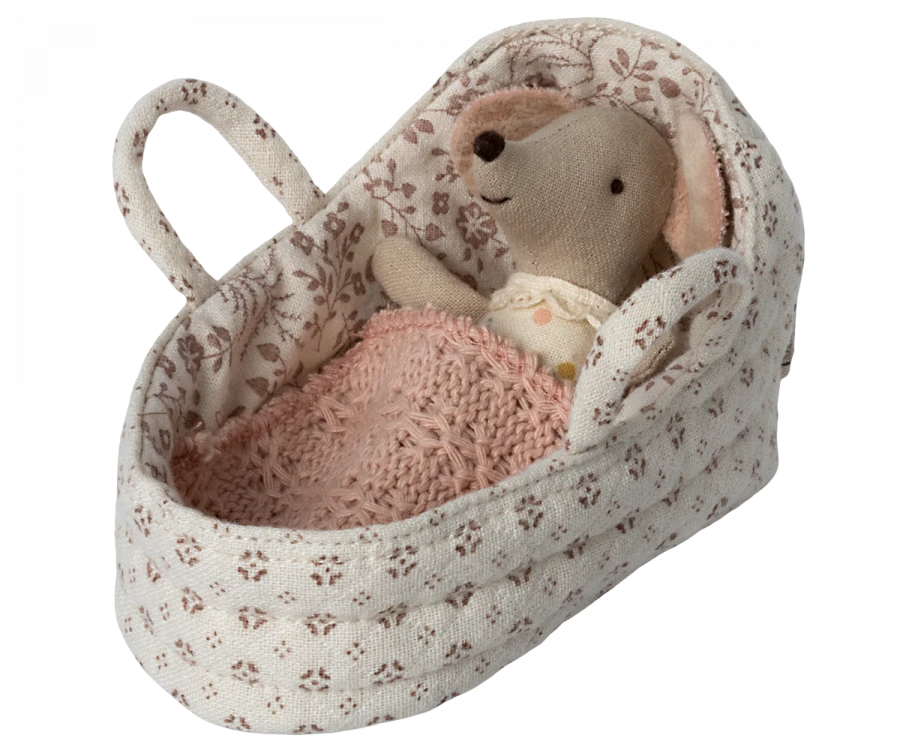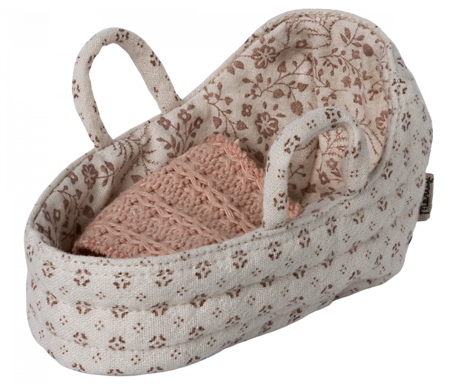 A small portable bed for your baby mouse. With this carrycot it is easy to bring along your baby, and it will sleep tight under the warm knitted blanket.