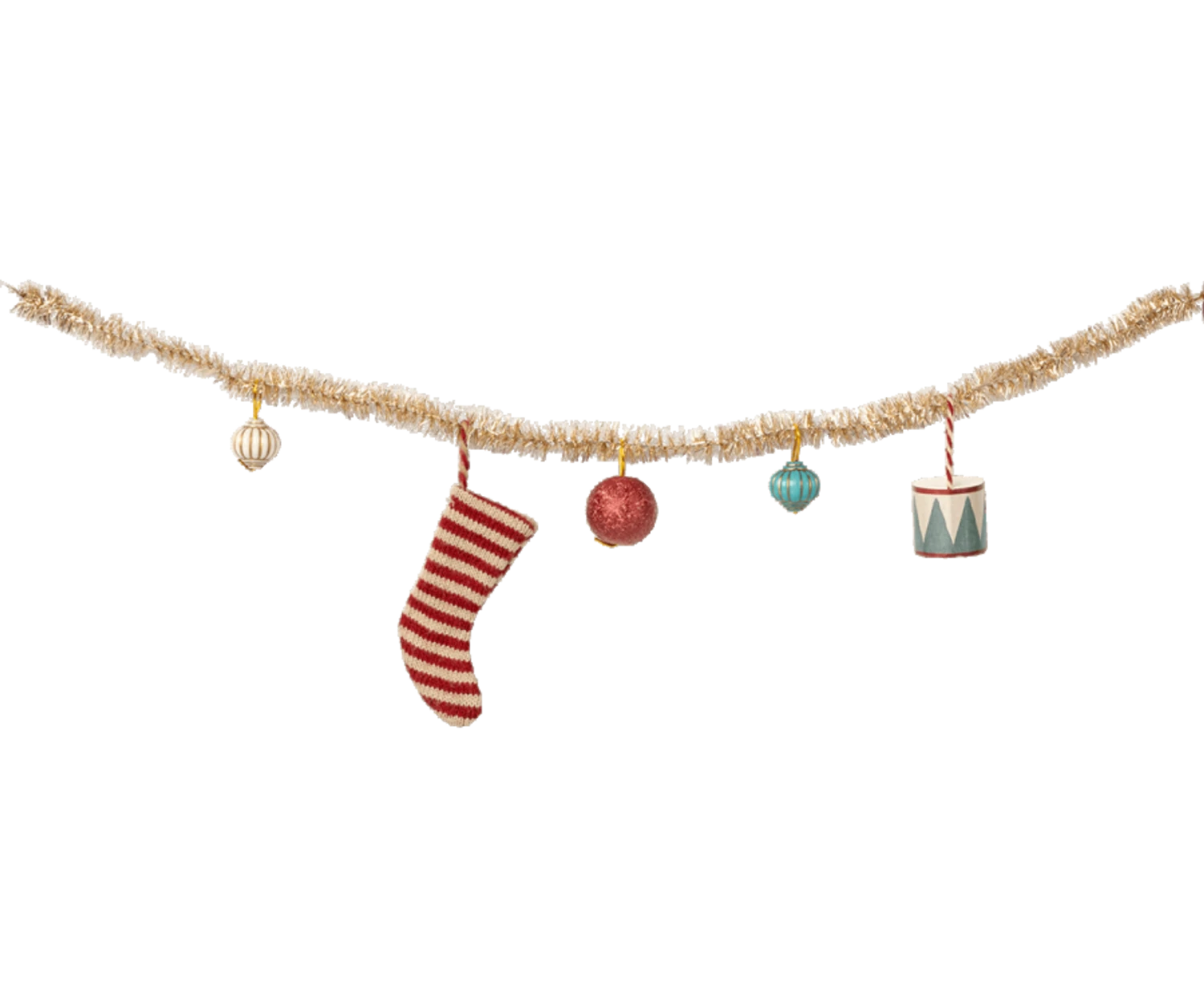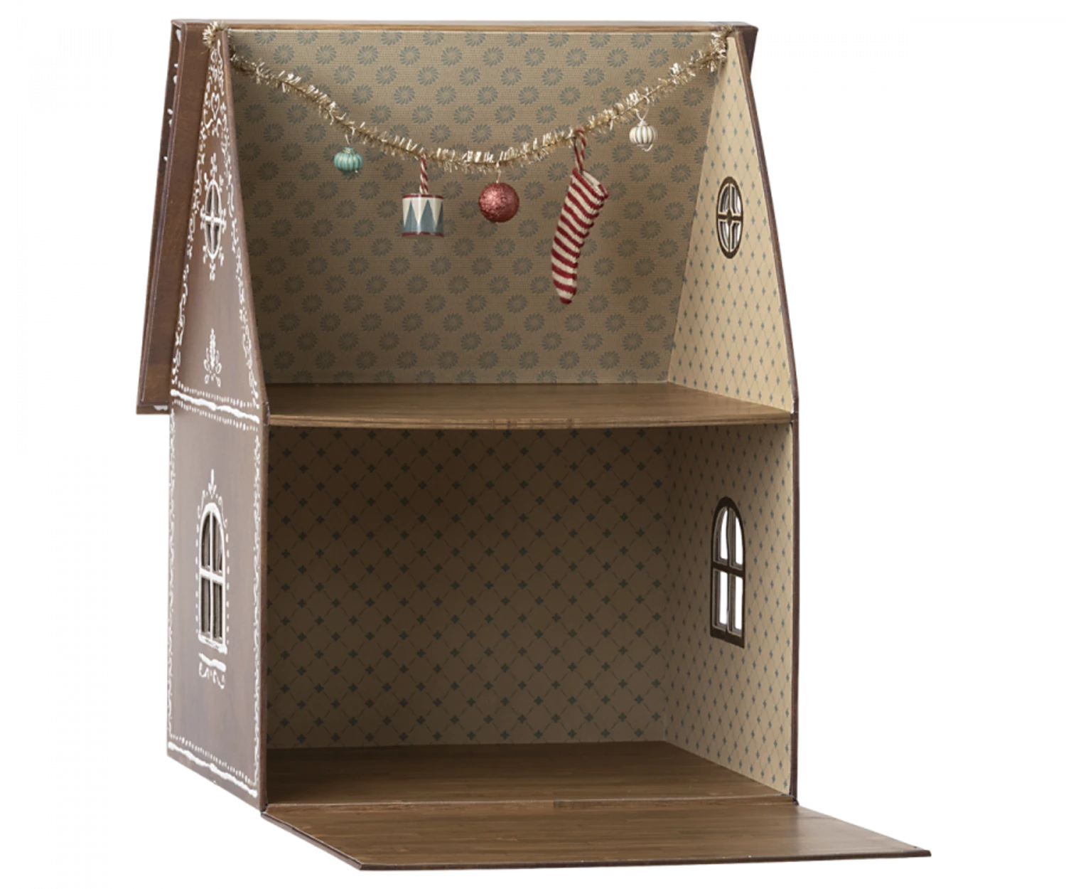 Decorate for Christmas in your miniature home with this glitter garland. Small ornaments, a wooden drum, and a soft stocking are added to give a cozy look and create a true Christmas atmosphere. Fits our larger gingerbread house as well as our larger wooden dollhouses.