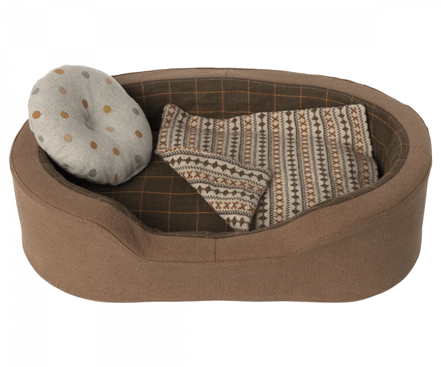 The perfect basket for the plush dog for a quiet moment of rest. It comes with a mattress, pillow and a soft blanket.