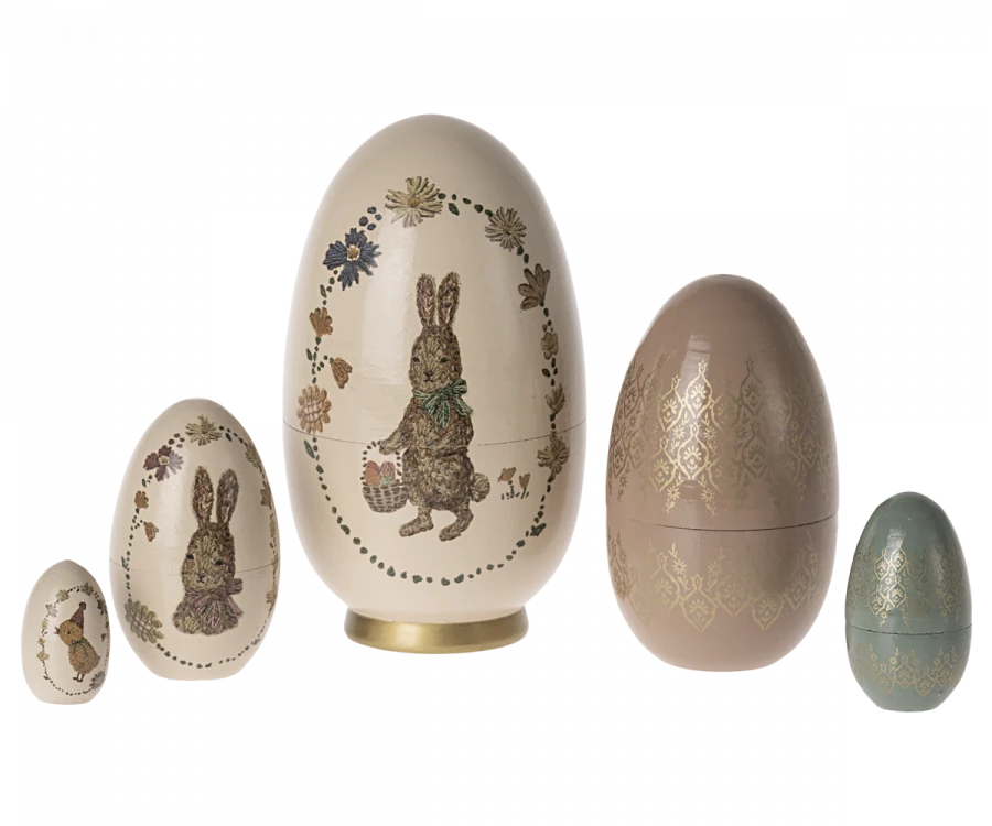 Make the Easter season even more magical with this lovely babushka egg set. It consists of 5 wooden eggs in different sizes which are packed into each other. All eggs are beautifully decorated with special Maileg drawings.
