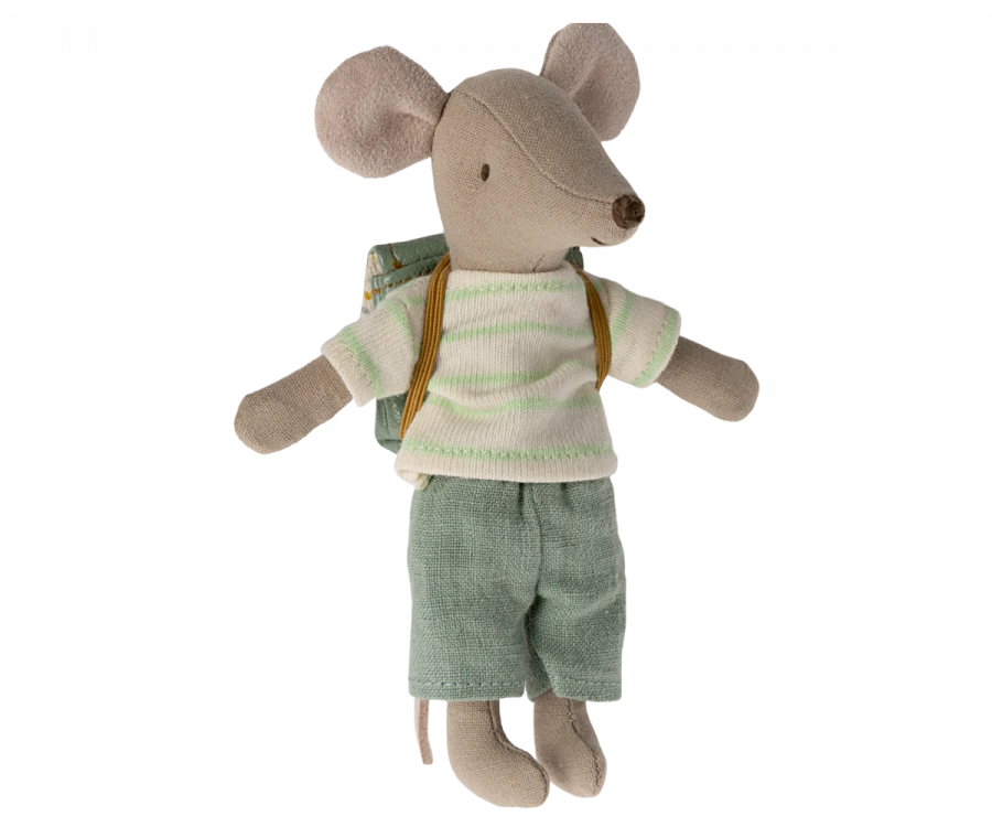Big brother mouse is dressed for a day in school, carrying his backpack on the back. He has magnets in his hands so he can hold the handles of the tricycle for a fast trip.