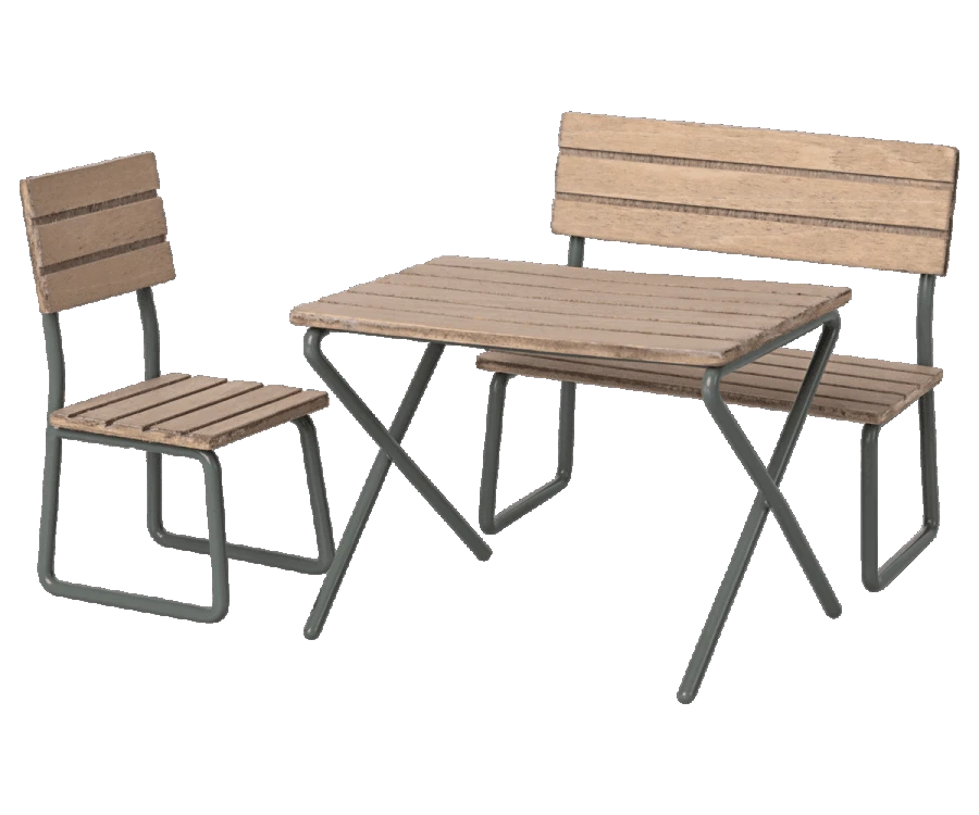 | This charming garden set is perfect for get-togethers, tea time, and so much more. It’s designed to have a worn, vintage look, just like real patio furniture. It fits our mice and micro size friends. Every piece of wood has its own character and structure and will vary from piece to piece. This wood is FSC certified, which means it is responsibly sourced from well-managed forests of small or community producers. |