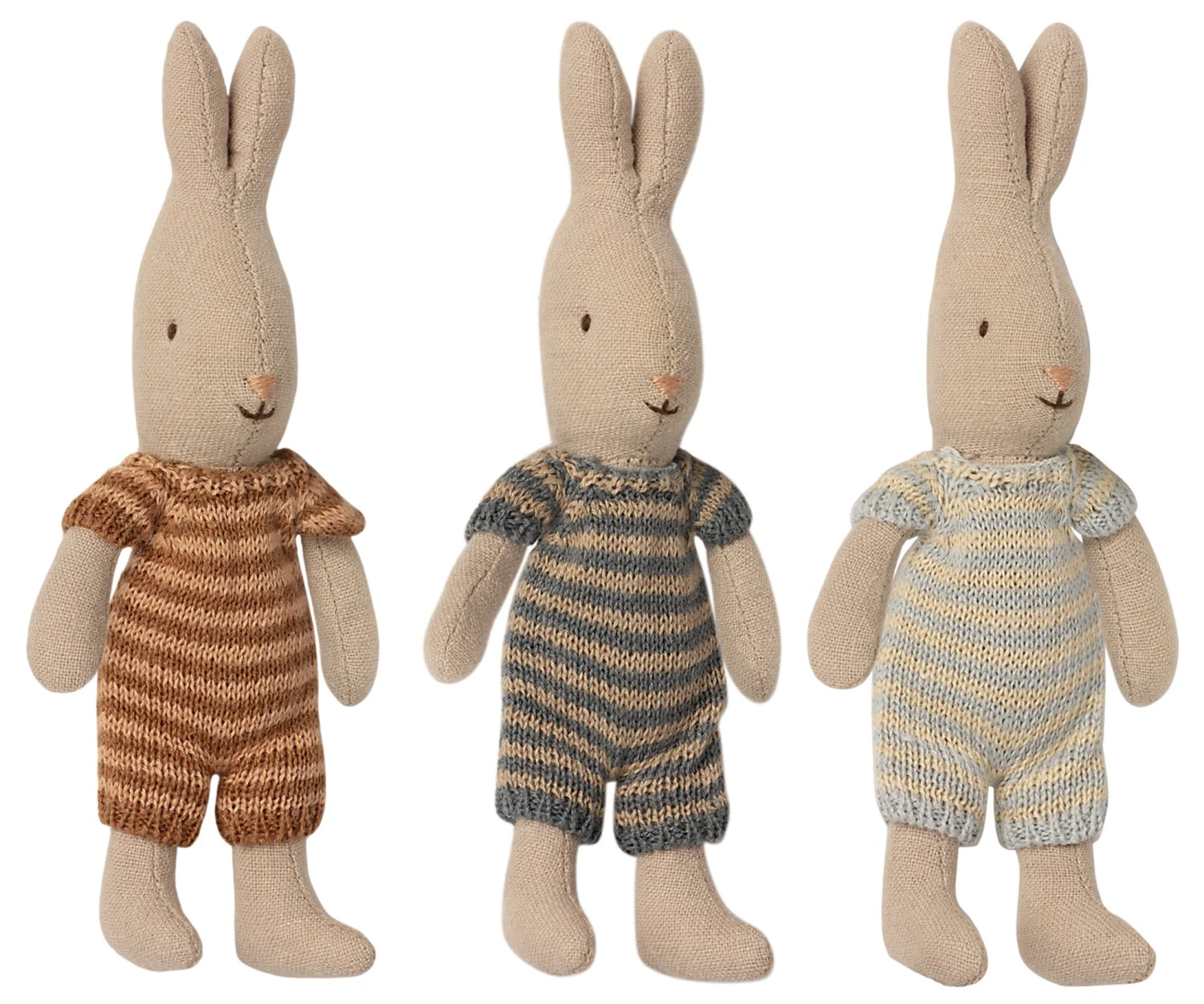 This sweet rabbit in micro size is dressed in a striped suit knitted in a soft linen/cotton blend. It fits all the micro size furniture and will surely lead to many hours of play! The knitted suit is made in 3 lovely color combinations.