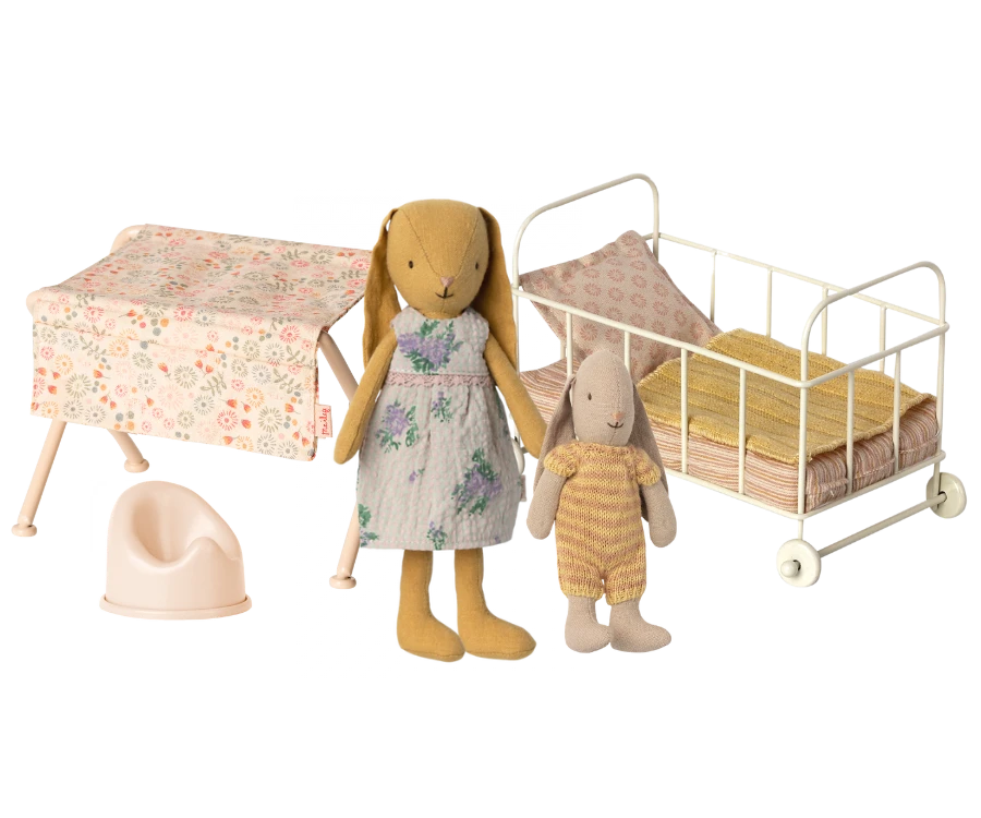 Introducing our Nursery Bundle! Take care of baby with your Maileg friends. This set fits perfectly into our House of Miniature Dollhouse.  Let story time begin with the perfect nursery scene.