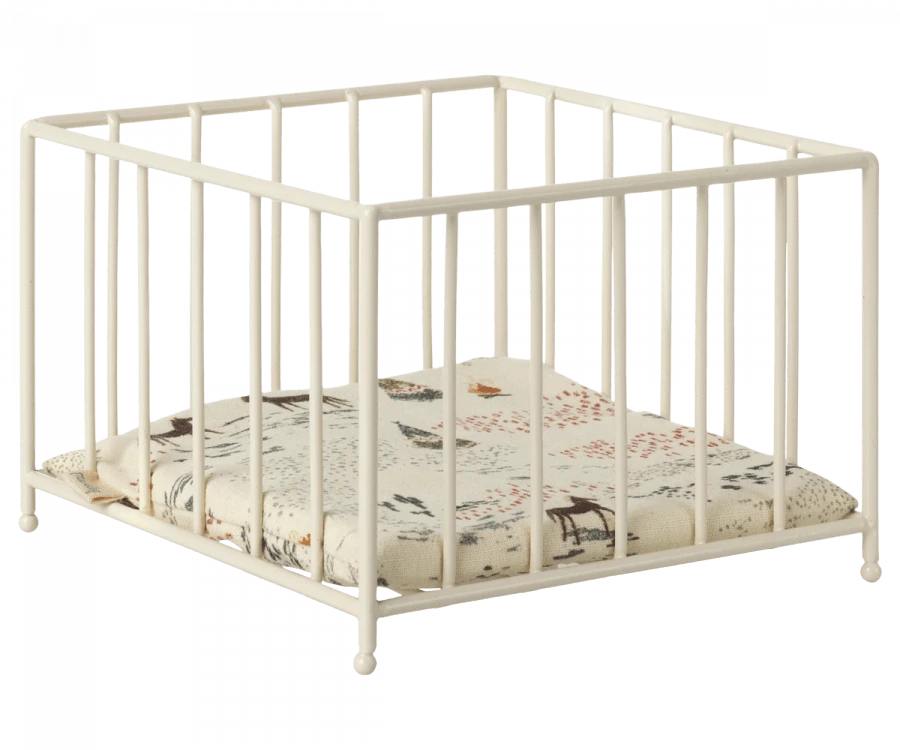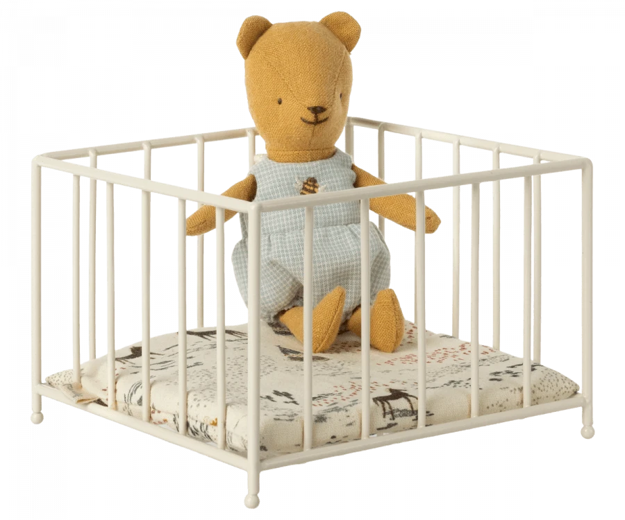 The playpen fits bunnies/rabbits in size micro and teddy baby. It will keep the small family members safe, and you can use it for a small play area. It is made of metal and has a soft mattress at the bottom.