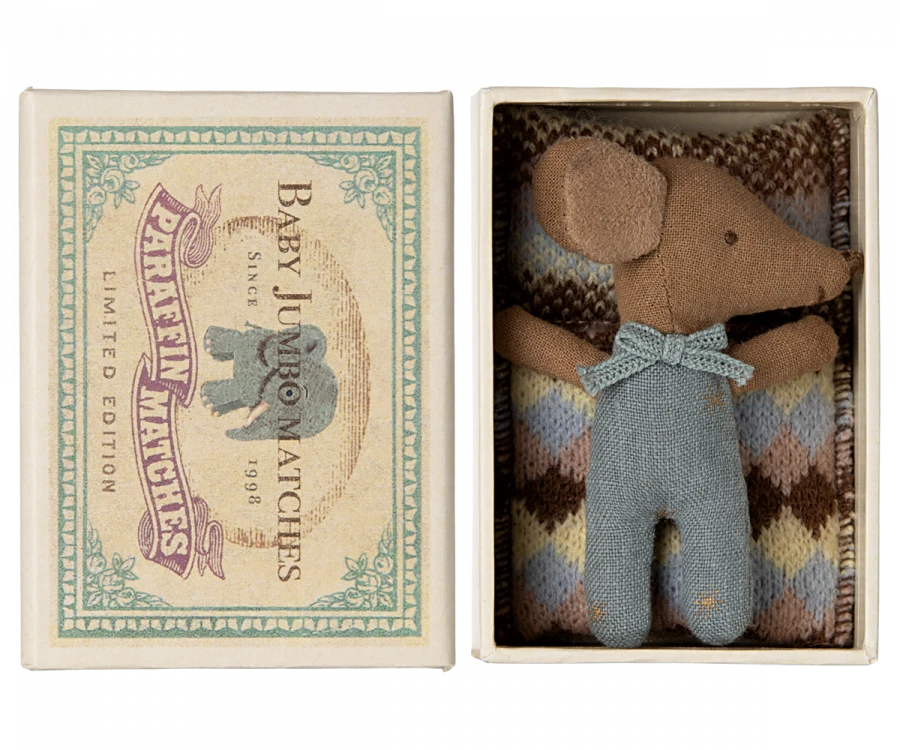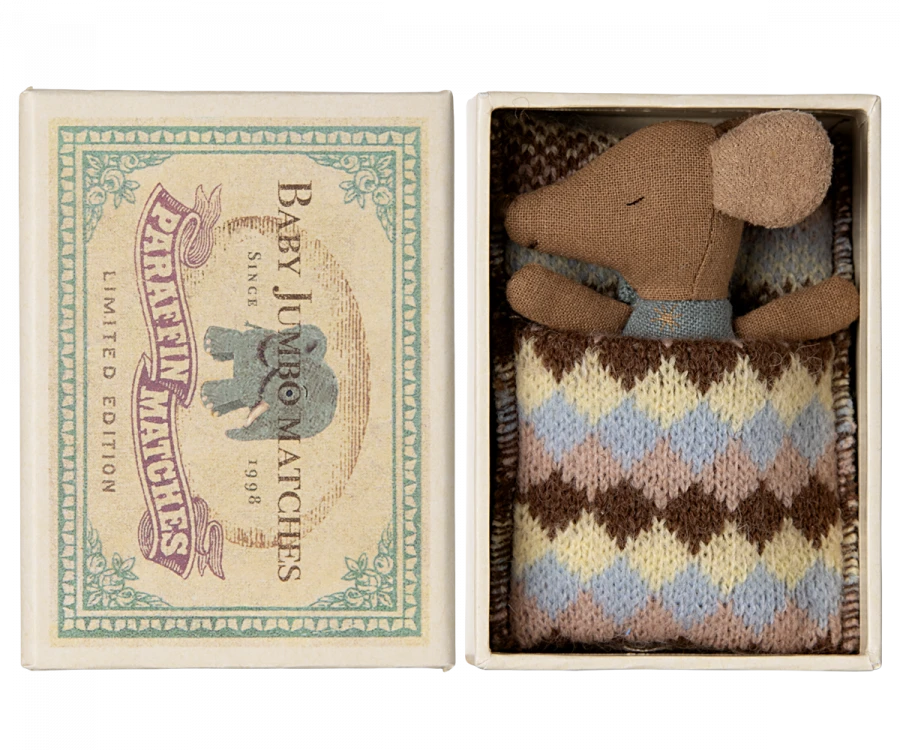 A classic Maileg item. This mouse is ready for hours of play and sleeps tight in the little matchbox. The clothes and bedlinen are made of soft fabrics with unique prints in beautiful colors.
