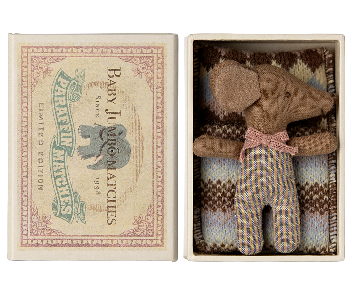 A classic Maileg item. This mouse is ready for hours of play and sleeps tight in the little matchbox. The clothes and bedlinen are made of soft fabrics with unique prints in beautiful colors.