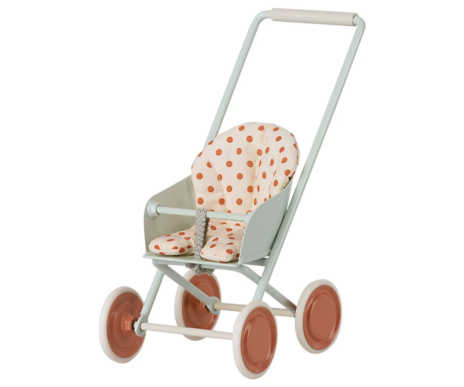 Bring your litte friends along on your errands and adventures with the Micro Sky Blue Stroller from Maileg! The Stroller fits MY and Micro Sized Friends, as well as Little Brother/Sister and Big Brother/Sister Mice! This soft sky blue stroller comes with white wheels with red centers, and a white and red polka dot cushion!