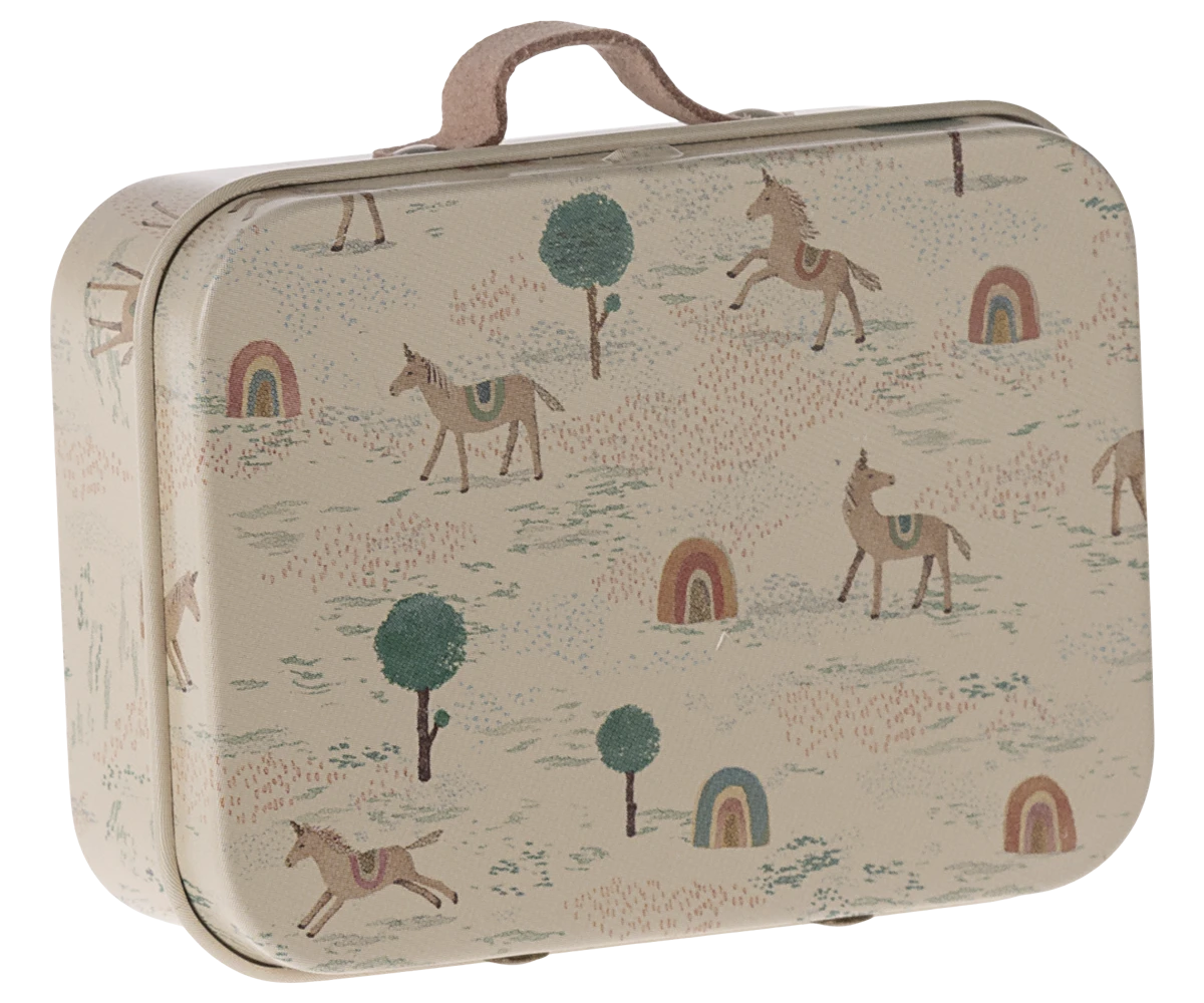 This small metal suitcase with colorful illustrations and beautiful details can be used for any occasion: small gifts, storage of small items or for mice and small bunnies to bring their belongings on the go.