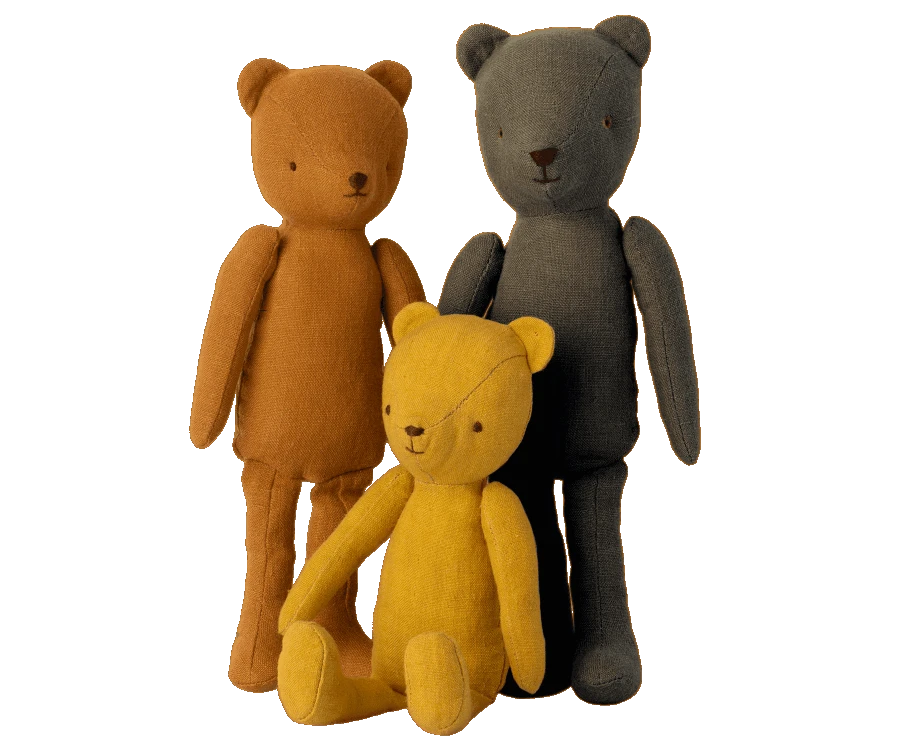 The Teddy bear family is a sweet collection of 3 different sizes of Teddy bears. They are made of soft linen and their shoulders are articulated so they can rotate and stay in place. The Teddy Family has a vintage look that will bring back dozens the memories.Â