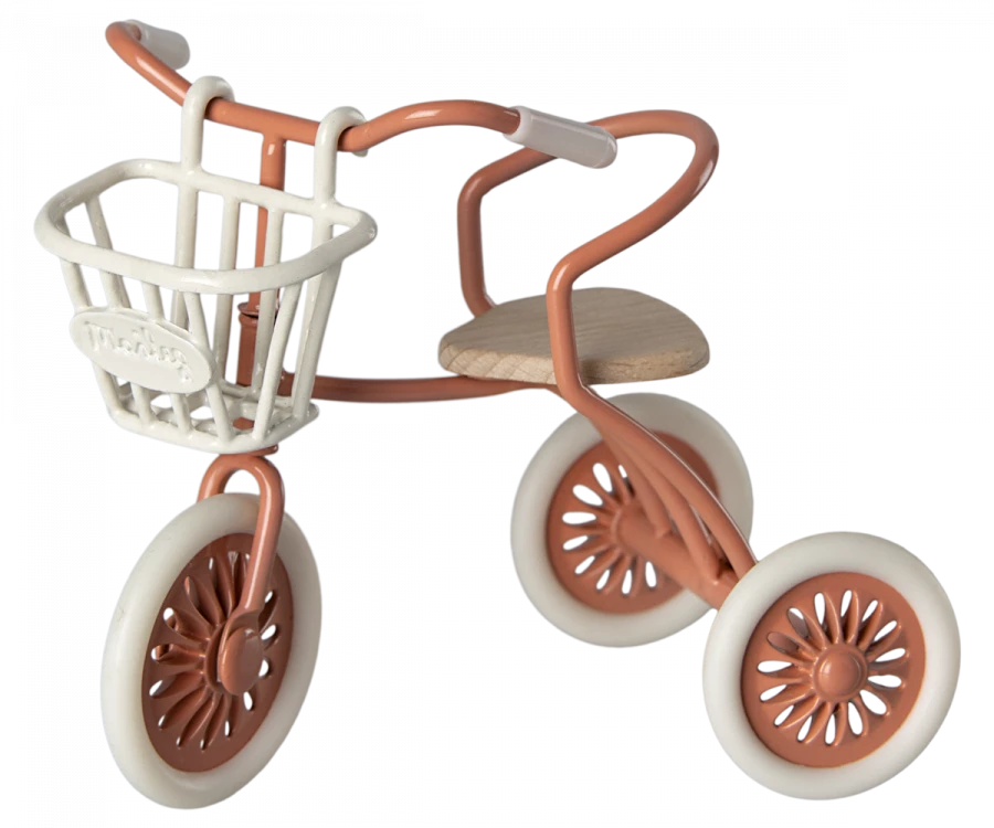 This metal basket fits Maileg tricycles. Place it on the handlebar and your mouse will always have storage space on the go, for any belongings.