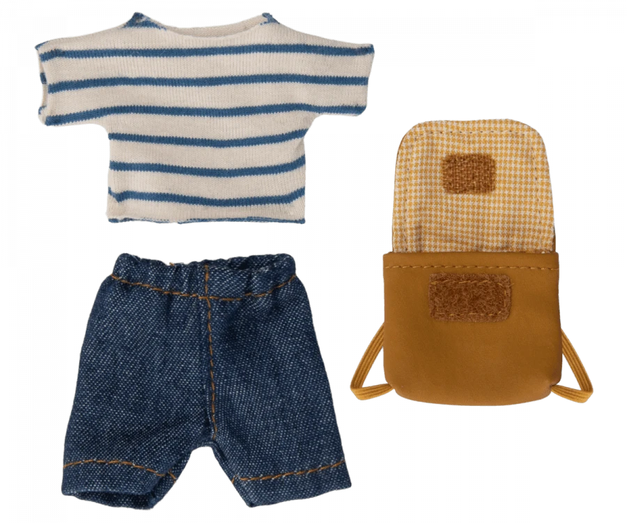 Big brother mouse is dressed for a day in kindergarten or school, carrying his backpack on the back. He has magnets in his hands so he can hold the handles of the tricycle for a fast trip.
