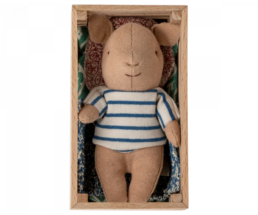 A sweet and cozy playset for imaginations to run wild. This cute little piglet cuddled up in its wooden box with cozy bedding, making a wonderful addition to any story. Add the bigger pigs to expand the playtime!