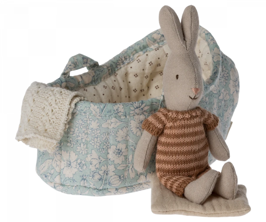 This playset is the perfect start to any story. A soft carry cot made in a beautiful fabric where the small bunny in colorful suit can easily be tucked for a nap, covered in the knitted blanket to keep warm.
