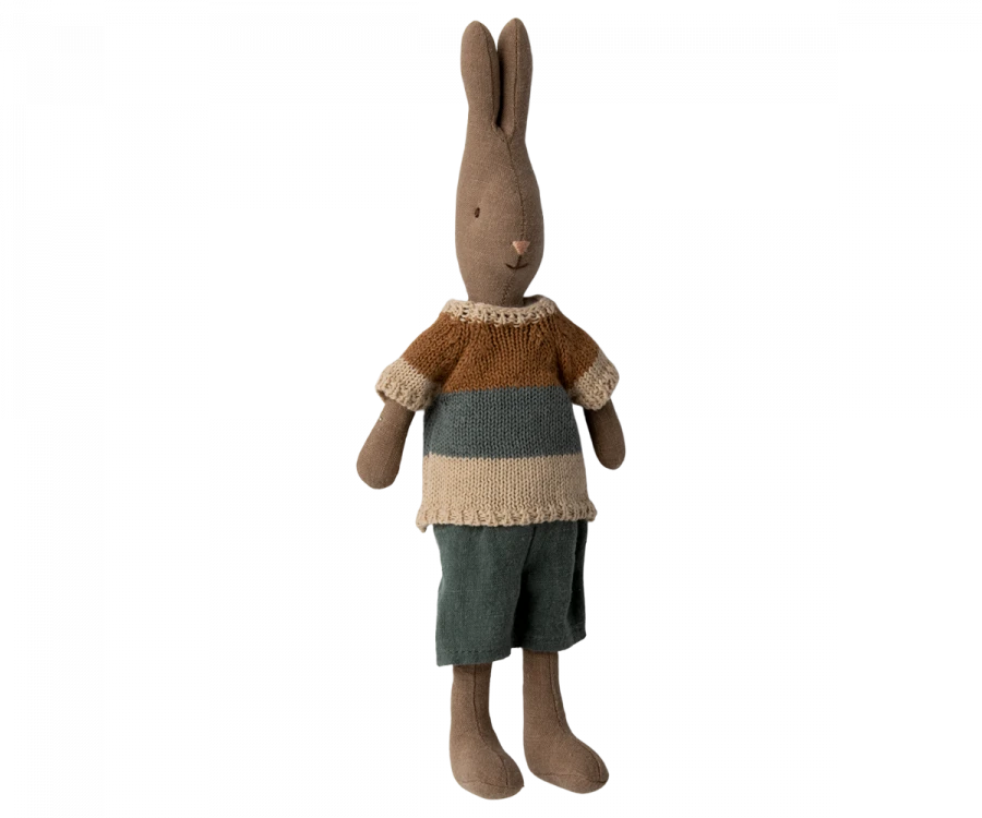 Our updated rabbit friend wears a sweet sweater and shorts that match just right. Rabbit’s beautiful fabric shows off his adorable pink nosey. Have fun setting the scene and watching your little one engage in creative, open-ended play. Let the story begin!