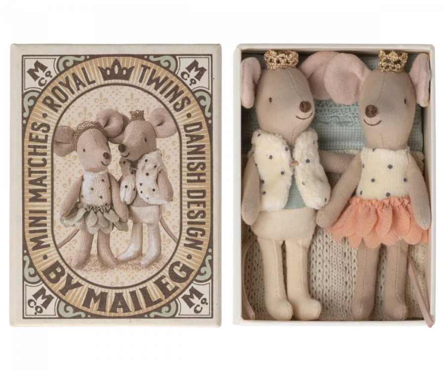 Make way for the royal heirs! This adorable duo’s outfits include complimenting accents, so they can always make a grand entrance together. They also share a customized matchbox that has their portraits printed on the top, how fancy! Our darling Royal Twins love to run around the castle together and play games. Little Sister likes to twirl and dance in her beautiful pedaled skirt. Little Brother looks so regal in his plush dotted vest and mint shaded shirt beneath it.