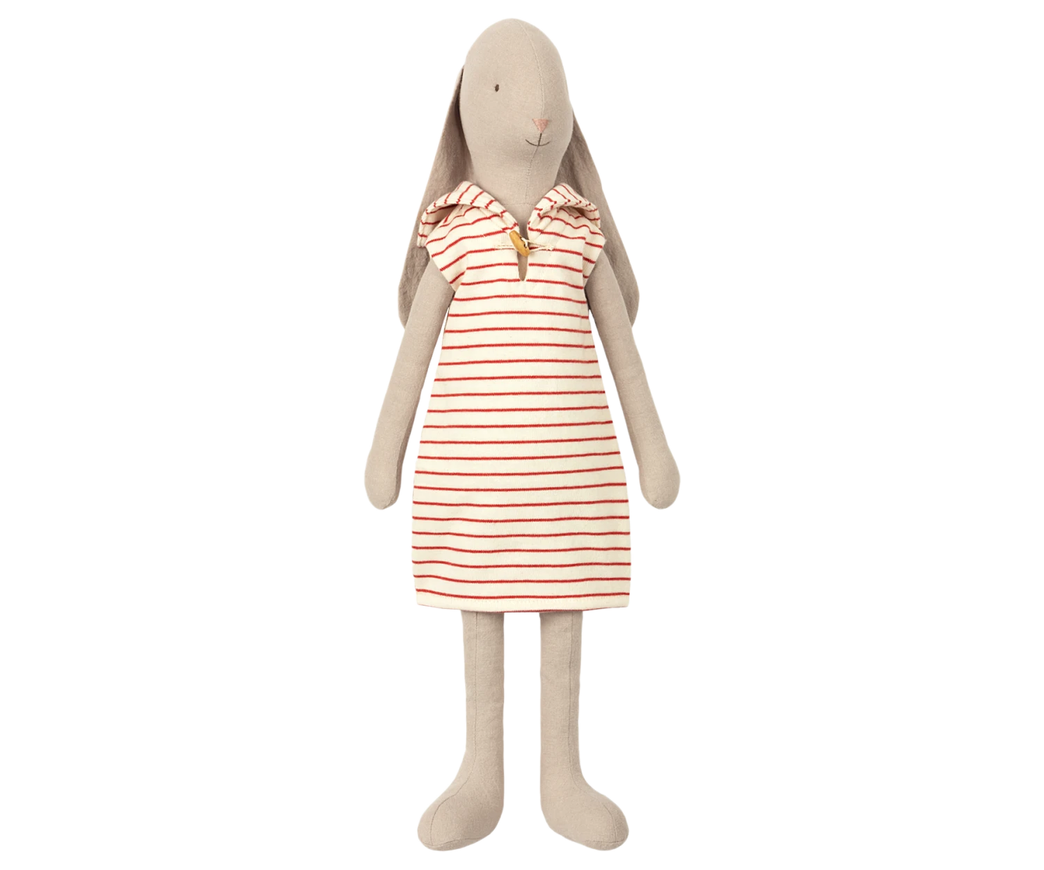 Ahoy matey! This size 4 Sailor Bunny is definitely not lacking in maritime style. She shows that a relaxing day out on the ocean needs to be coupled with an outfit that is equally as carefree. This Bunny is dressed in an off-white and red striped dress that is fit for any fashionable day at sea. Set sail with this new Bunny friend this summer!