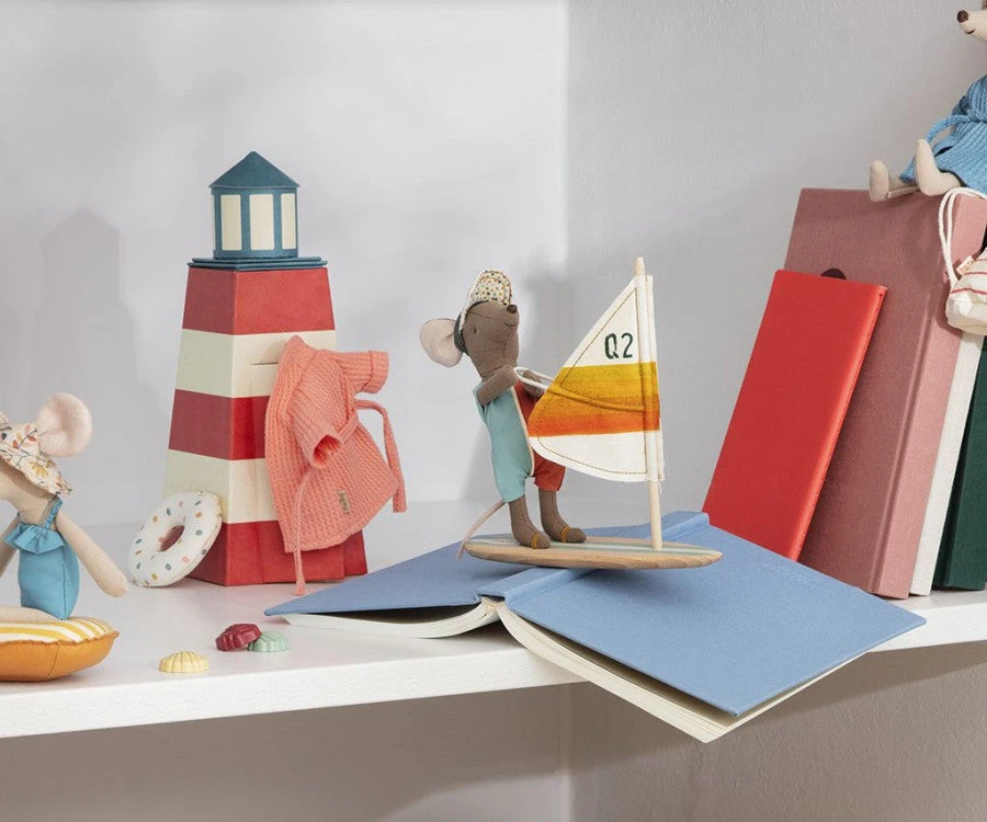 Surfer big brother is the instructor for his two pupils: little brother and sister surfer mice. Heβs wearing an instructor wetsuit that is dusty red and aqua. The wetsuit keeps him safe and warm in the cool water and waves. He also has a speckled visor to keep the sun out of his eyes so he can see. His wooden surfboard has mint blue and white stripes with a colorful βQ2β sail. The board includes two elastic straps at the bottom so he can keep his feet in place. Big brother surfer also has magnetic hands, so he can steer his sail wherever he wants to go!