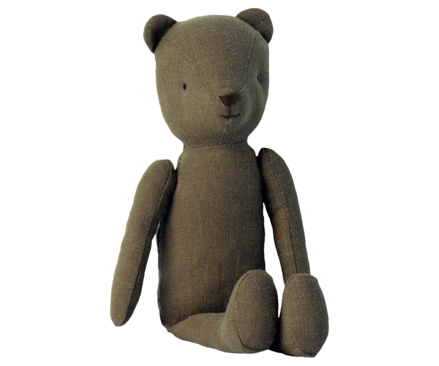The Teddy bear family is a sweet collection of 3 different sizes of Teddy bears. They are made of soft linen and their shoulders are articulated so they can rotate and stay in place. The Teddy Family has a vintage look that will bring back dozens the memories. Dad is a Dusty Green color.